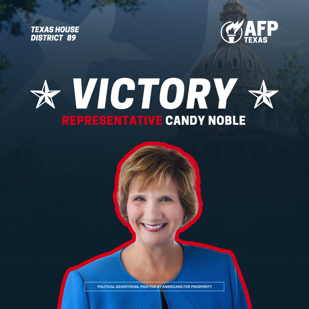 AUSTIN, TX – Americans for Prosperity-Texas (AFP-TX) today celebrated the wins of five policy champions in their primary races for the state House: Angelia Orr (HD 13), Will Metcalf (HD 16), Terri Leo-Wilson (HD 23), Candy Noble (HD 89), and Morgan Meyer (HD 108).